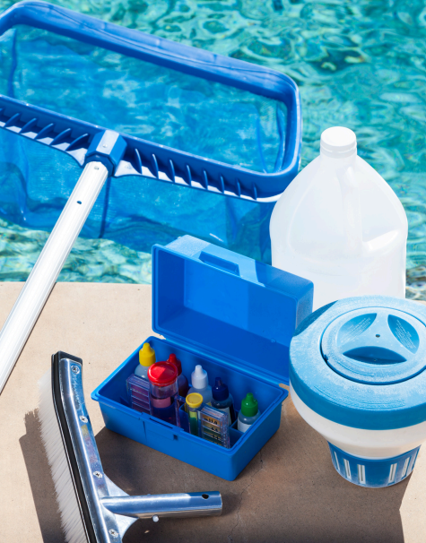 Me ocupo de la limpieza de piscinas (fondo, bordillos y superficie con pértiga, red y medidor de cloro), del ajuste y control de productos químicos, y del mantenimiento del cuarto de motores.